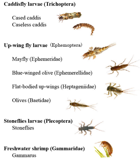 Our riverfly monitoring programme is part of the nationwide Anglers Riverfly Monitoring Initiative (ARMI) run by the Riverfly Partnership. Volunteers collect samples of river invertebrates once a month from April to October and then record what they find. There are eight groups of invertebrates to look out for: mayflies, olives, blue-winged olives, flat-bodied mayflies, cased caddisflies, caseless caddisflies, stoneflies and freshwater shrimp. These are chosen for how easy they are to identify and their different sensitivities to pollution.